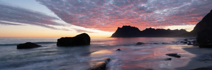Uttakleiv beach red fire sunset sunrise Lofoten islands norway 2